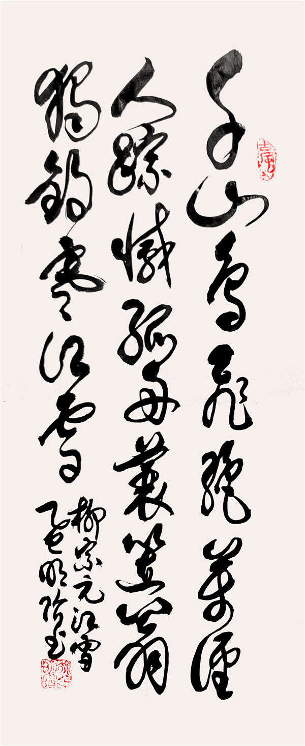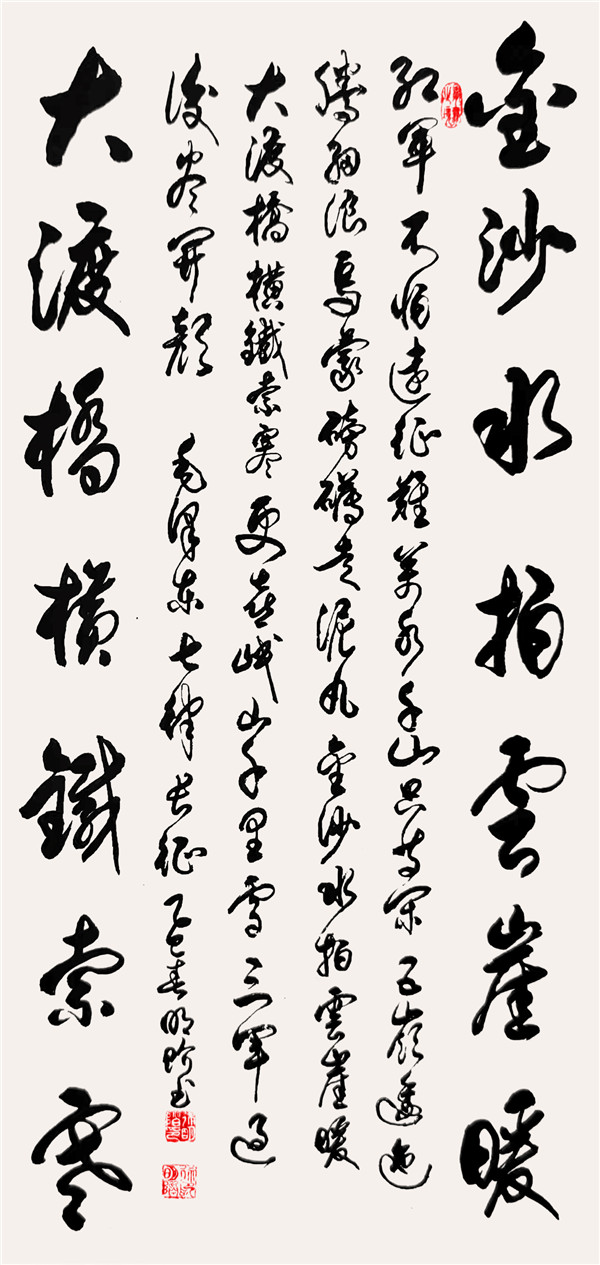 其草书创作深得张怀瓘《书断》中 “婉若银钩,漂若惊鸾” 之妙,如《独钓寒江雪》的狂草演绎,笔画连绵处气脉贯通,断笔处亦 “血脉不断”,将柳宗元诗中孤高之境化为墨色的跌宕起伏。这种对草书 “流而畅” 特质的把握,暗合孙过庭《书谱》“草以点画为情性,使转为形质” 的奥义,每一次使转都成了情感的注脚,在《长征》诗的书写中,大渡桥横的铁索寒被他以苍劲线条凝为历史的铿锵回响。
