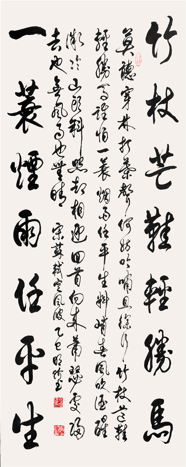 行楷作品则展现 “稳中有活” 的风貌,以楷立骨,藏锋起笔如蓄力,提按间见 “横细竖粗” 的匠心,将家国情怀熔铸为笔墨的磐石之姿;《定风波》又以行显韵,字距行距随词意起伏,浓淡墨色如人生烟雨,完美诠释 “文墨相发” 的创作境界。